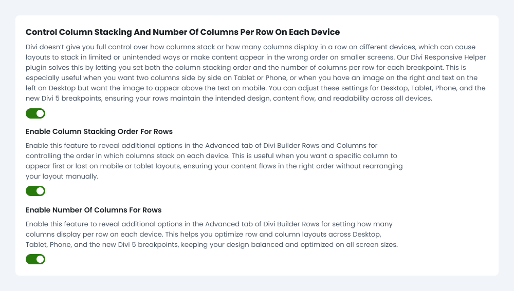 The Divi Responsive Helper plugin adds advanced layout controls for rows, allowing you to decide how many columns appear side by side on each device and exactly how those columns stack when space becomes limited. These features work together to help you create responsive layouts that remain clear, intentional, and easy to read across all screen sizes.