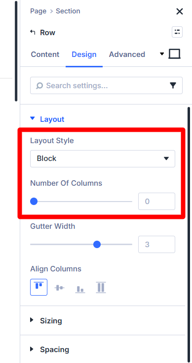 Open the Row settings and go to the Design tab to the Layout toggle. There, you will see the Number of Columns setting added by our plugin (when the Layout Style is set to Block).