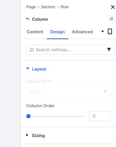 NOTE: The Column Order setting, which is added by our plugin, only becomes available when the Layout Style dropdown is set to Block AND you switch to Tablet or Phone. It will not show on Desktop since it is irrelevant there.