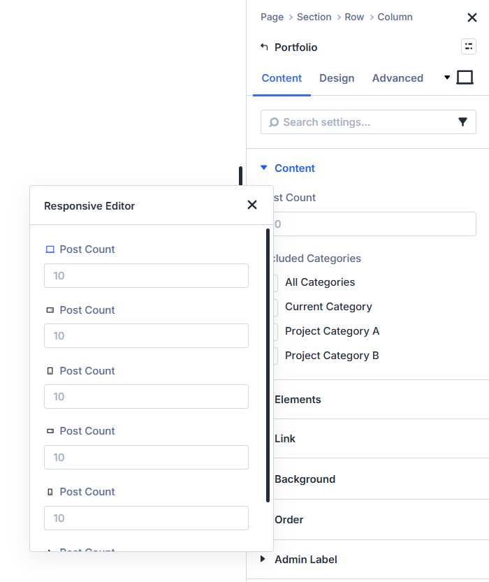 After enabling the Portfolio Module Project Count setting globally, a new responsive editor option will become available for the Post Count setting in the Divi Builder. This allows you to set the project count for each breakpoint. The setting itself is technically already there, but it is not responsive, meaning it does not have the options to set the number for each breakpoint as expected. Our plugin enables this ability.