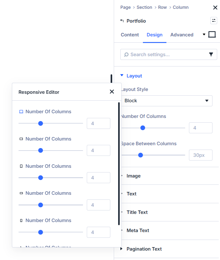 Once the Portfolio Module Number Of Columns setting is enabled globally, a new set of settings will become available in every Portfolio module in the Divi Builder.