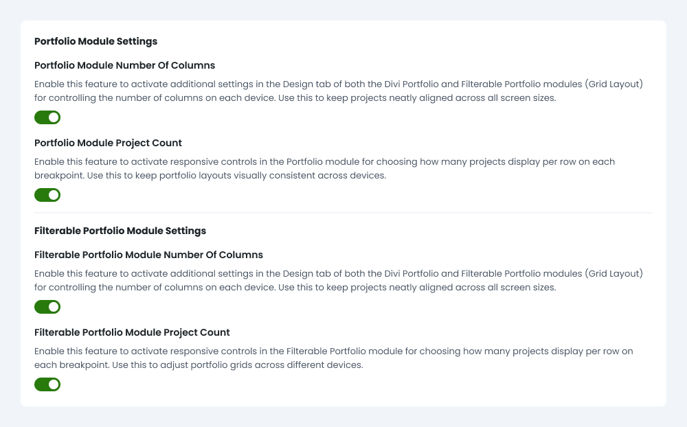 The Divi Responsive Helper plugin extends both the Portfolio and Filterable Portfolio modules with responsive controls for project count and column layout. You can define how many projects are displayed and how many projects appear side by side at each breakpoint. These features work together to help you create portfolio layouts that feel intentional, readable, and visually balanced across all screen sizes.